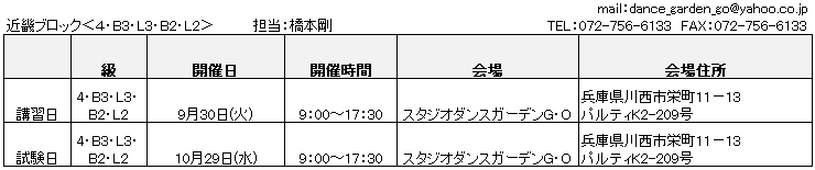 - 「B」はボールルーム部門のみ、 「L」はラテン部門のみ試験を実施。左記表示が無い場合は両部門の試験を行う。